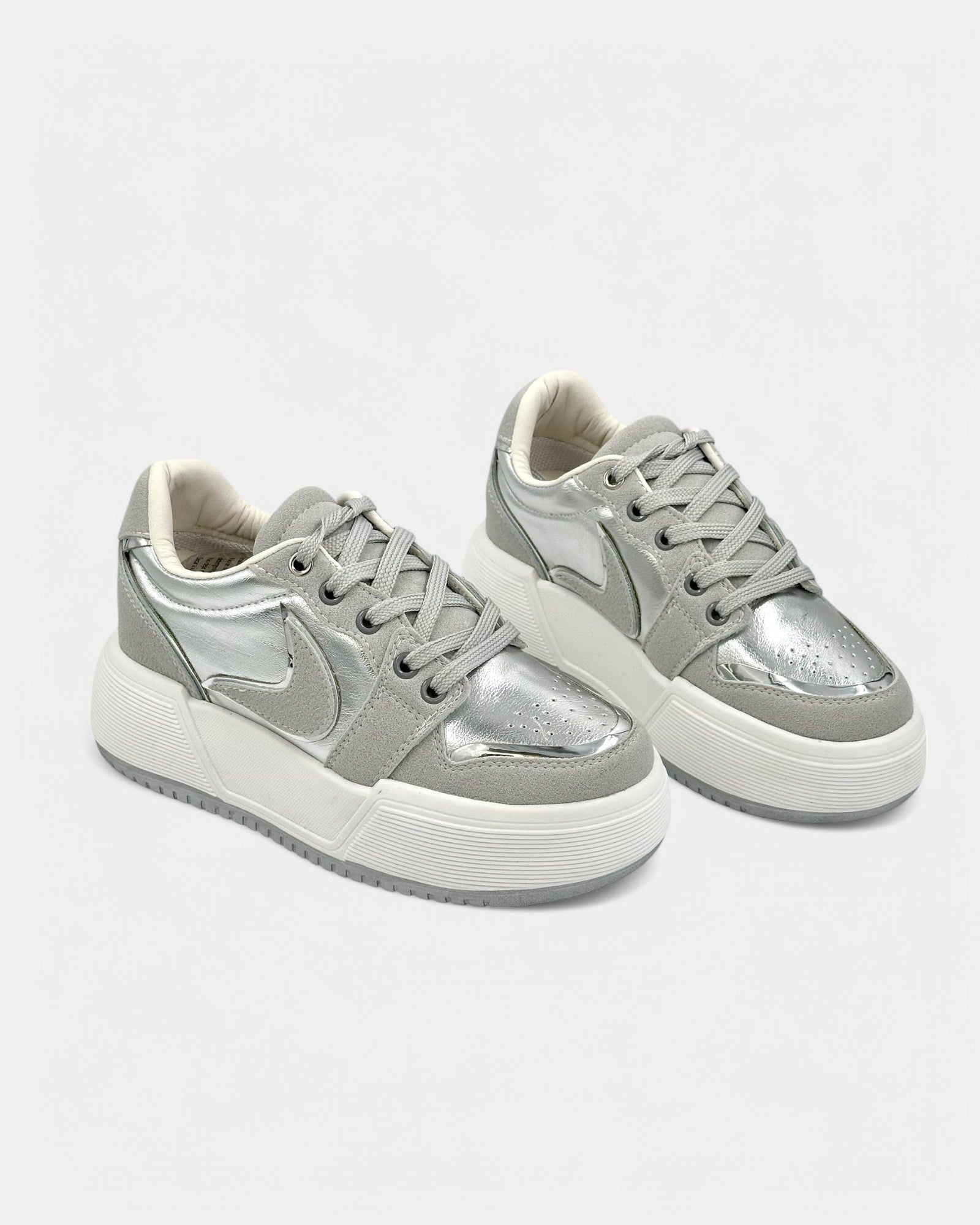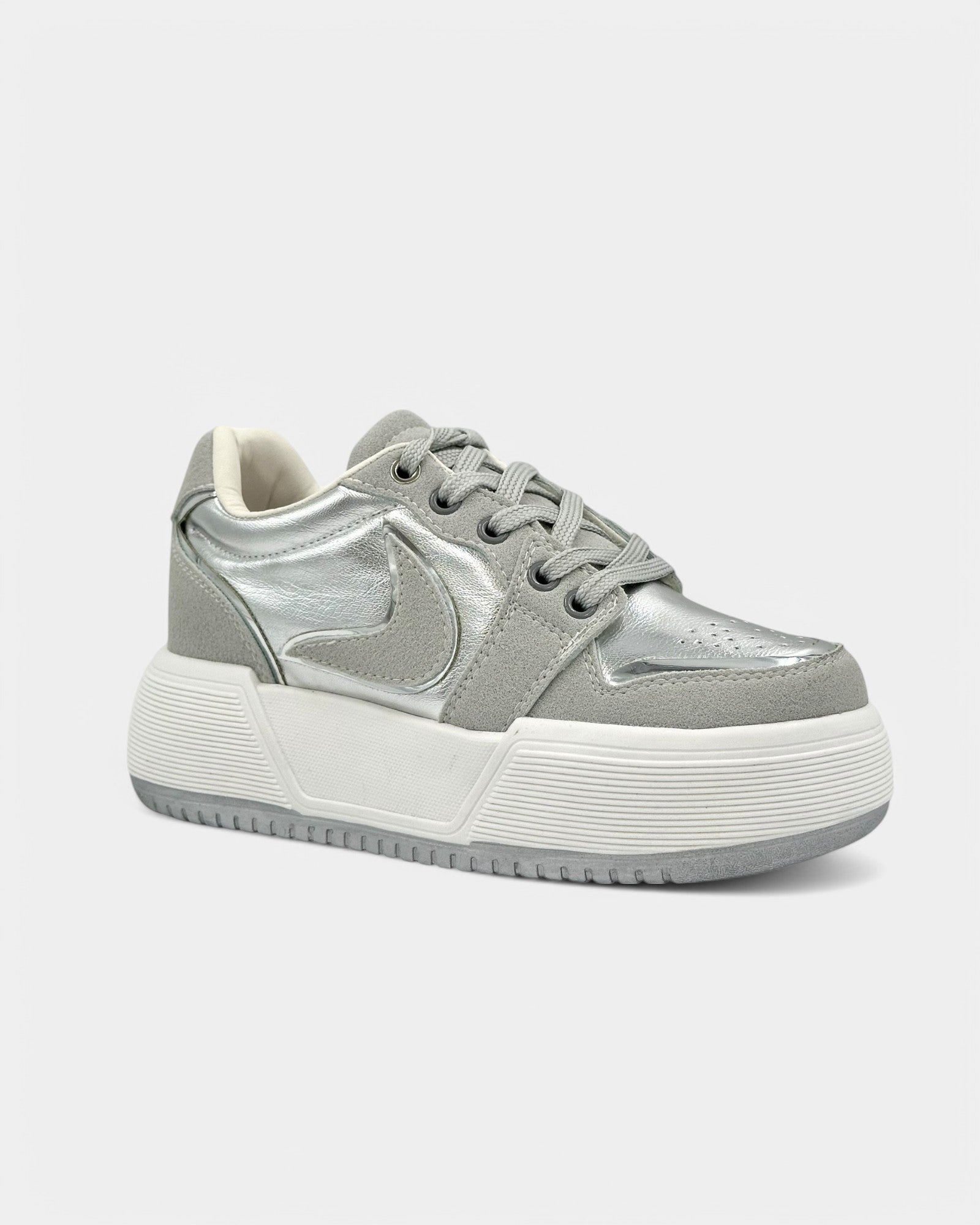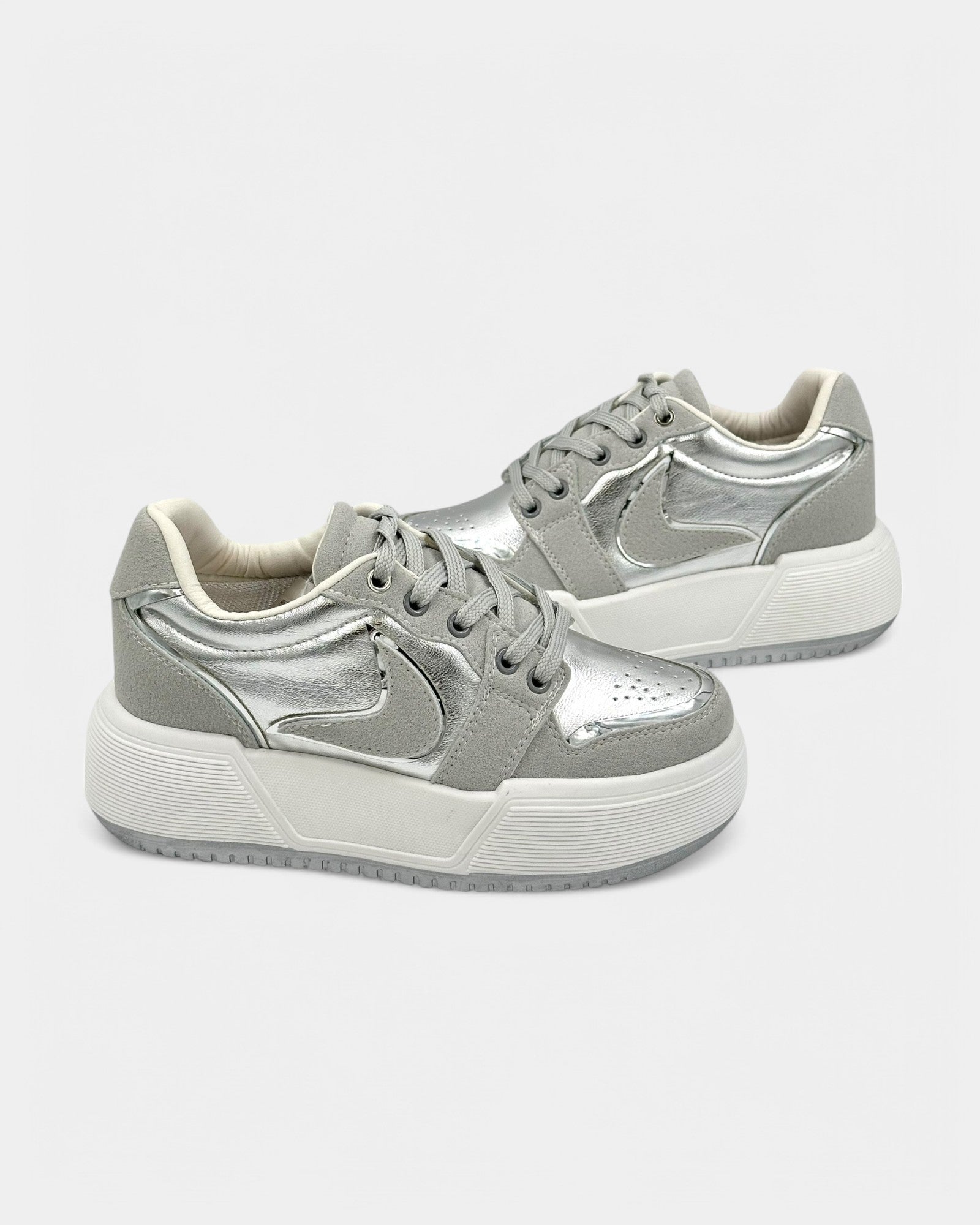 Descubre el equilibrio perfecto entre estilo y comodidad con estas zapatillas deportivas de diseño vanguardista. Con una combinación de cuero sintético y gamuza en tonos gris metalizado, este calzado ofrece un look sofisticado y versátil para cualquier ocasión. Su suela gruesa blanca proporciona una excelente amortiguación y soporte, ideal para un uso diario o actividades deportivas. Los detalles en acabado brillante y los ojales metálicos añaden un toque de elegancia, mientras que los cordones ajustables garantizan un ajuste seguro y personalizado.